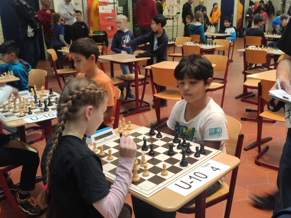 Mit fünf Schülern aus der dritten und vierten Klasse ging es zum Jugend-Schnellschach Turnier nach Bamberg. Nach mehreren Turnieren „daheim“ in der eigenen Schule, war dies für alle fünf das erste Turnier außerhalb. In 7 Runden ging es darum Punkte zu sammeln um sich in seiner Altersklasse möglichst weit oben in der Tabelle zu platzieren. In der Altersklasse 10 gingen 27 Spieler an den Start. David platzierte sich auf Rang 14, Sharoz auf 11 und Ömer auf 4, punktgleich mit dem dritten. Nur die Buchholzwertung (eine Stichwertung) verhinderte mit 27,5 zu 28 eine Medaille.